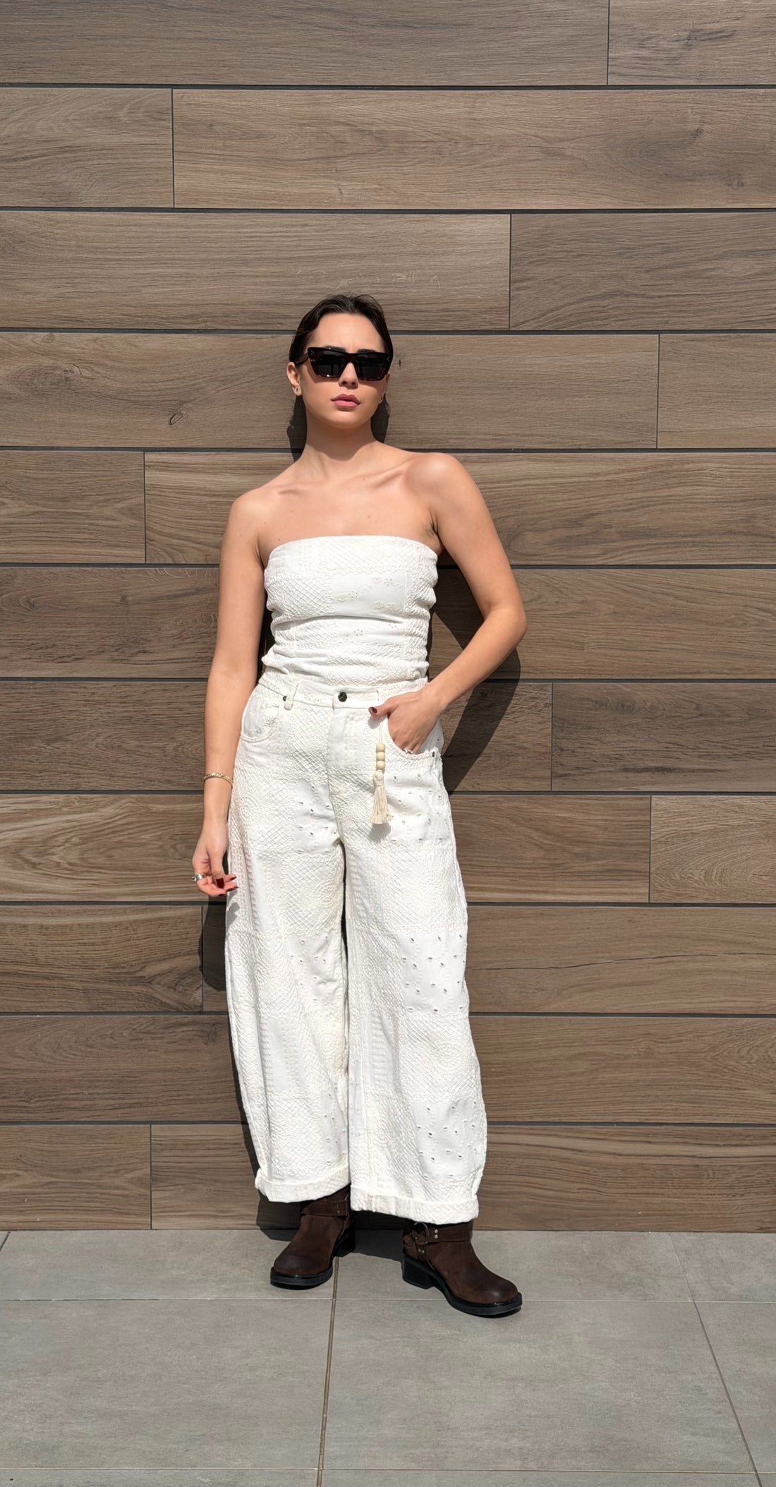 Jeans mom fit,tela con ricamo crochet,vita elasticizzata con molla, dettaglio ciondolo con frangia.
