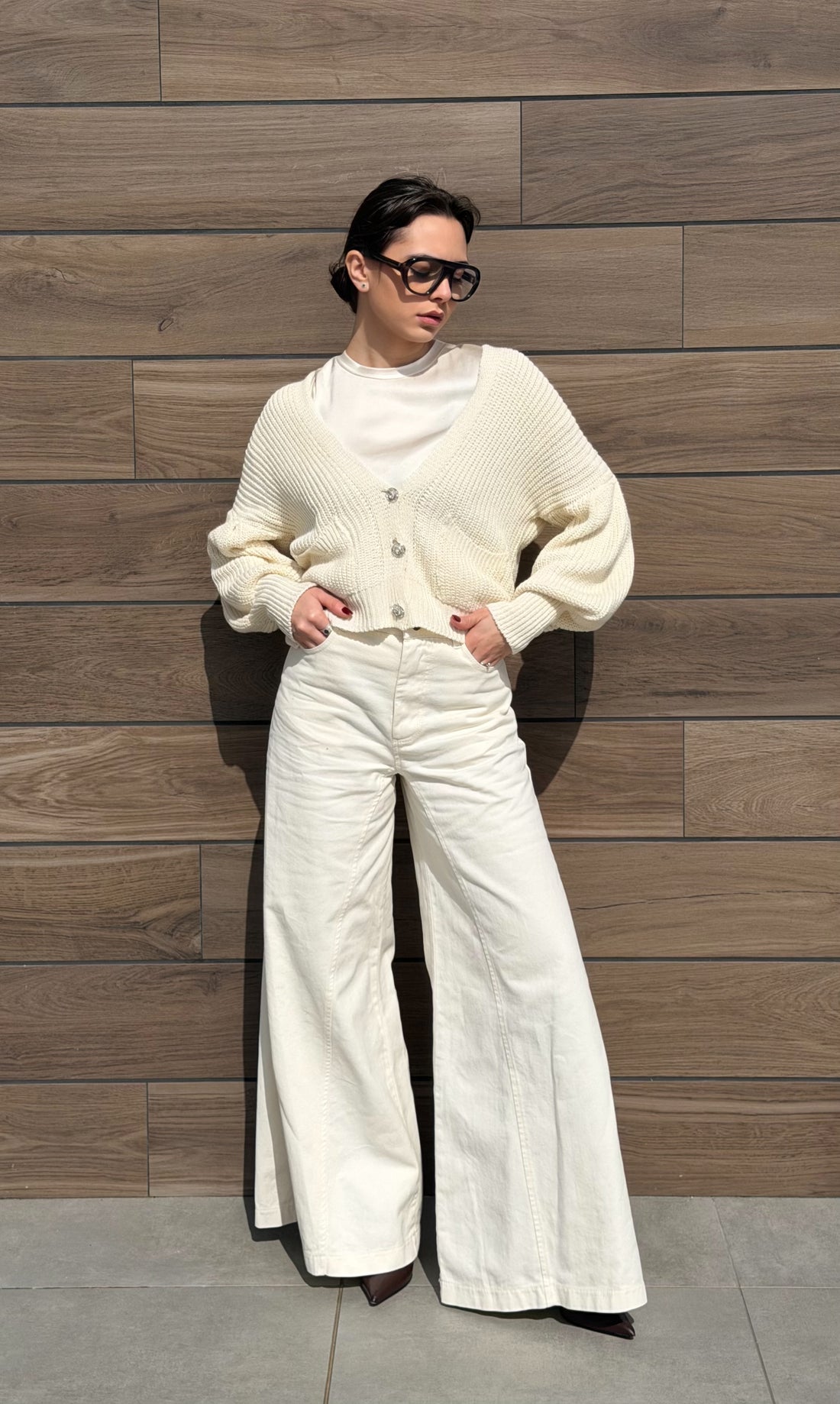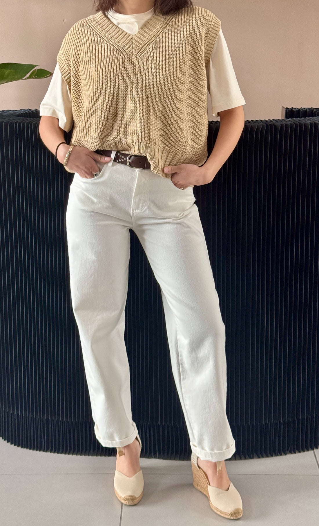 Jeans pantapalazzo gamba sul fondo molto ampia. Unica variante colore Riso.
