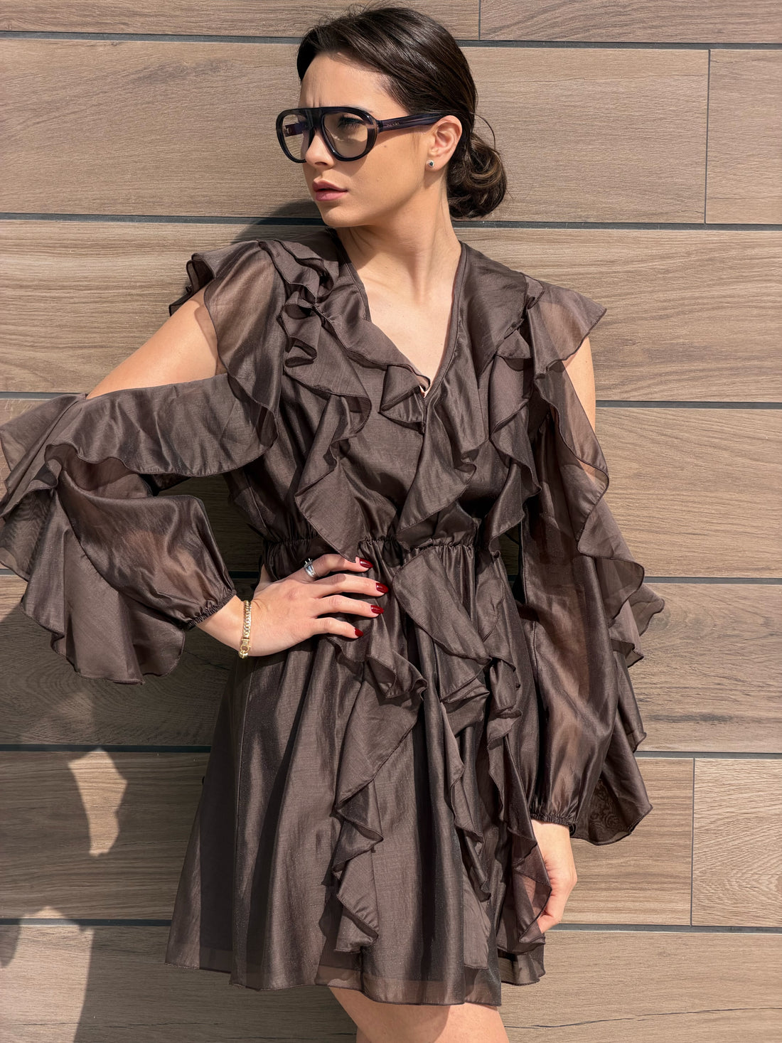 Mini Dress color cioccolato con dettaglio rouches su tutto il vestito. Manica con apertura omerale...