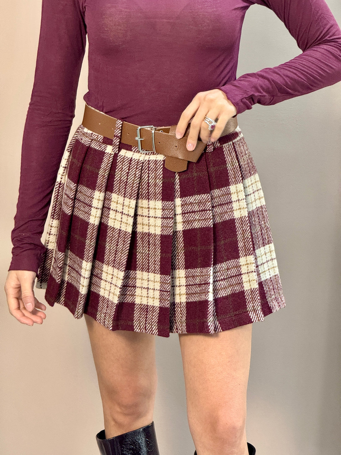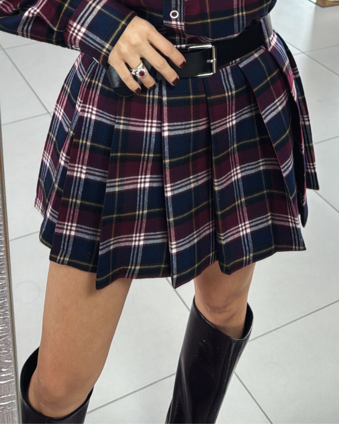 Gonna mini modello a pieghe disponibile nella variante colore bordeaux. Fantasia check con cintura incorporata....