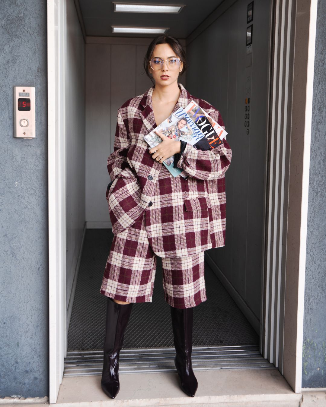 Mini gonna check nell'unica variante colore blu e bordeaux. La modella è alta 1.68cm e...
