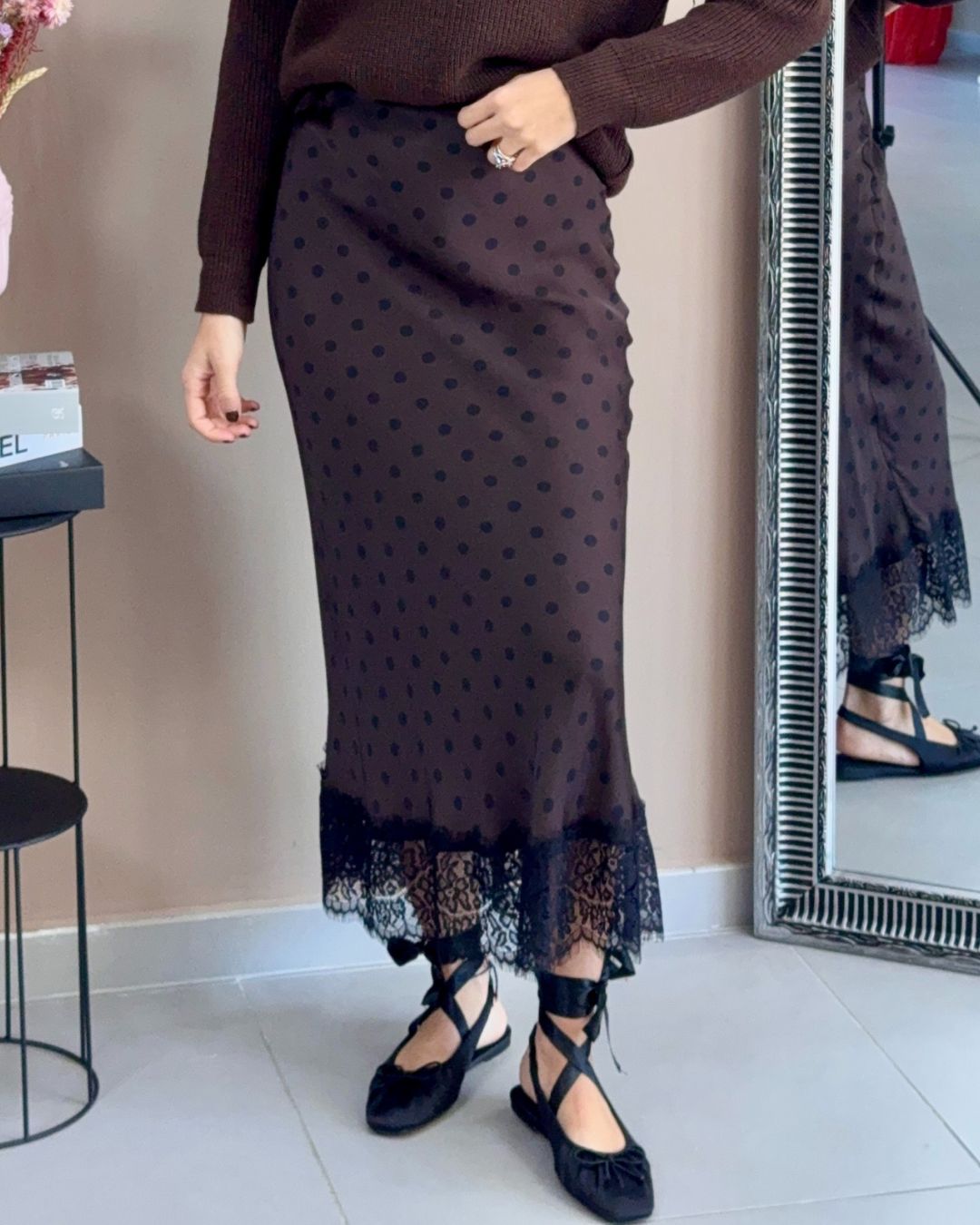 Gonna in satin a pois con fondo di pizzo a contrasto nero, elastico in vita....