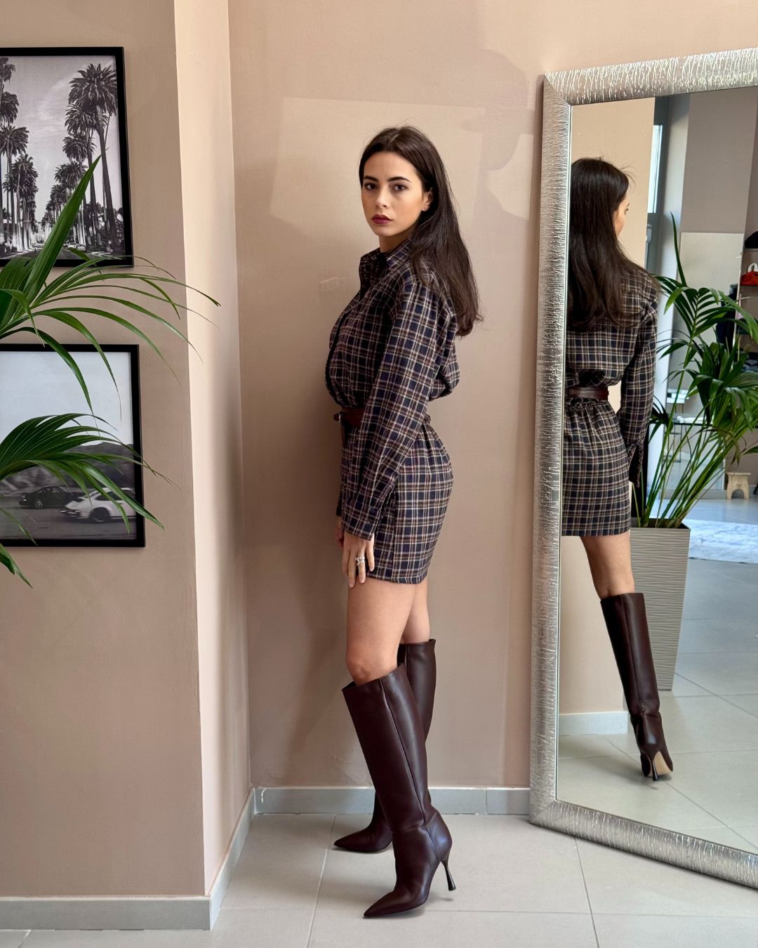 Abito in flanella, corto in fantasia a quadri marrone e blu. Cintura non inclusa.