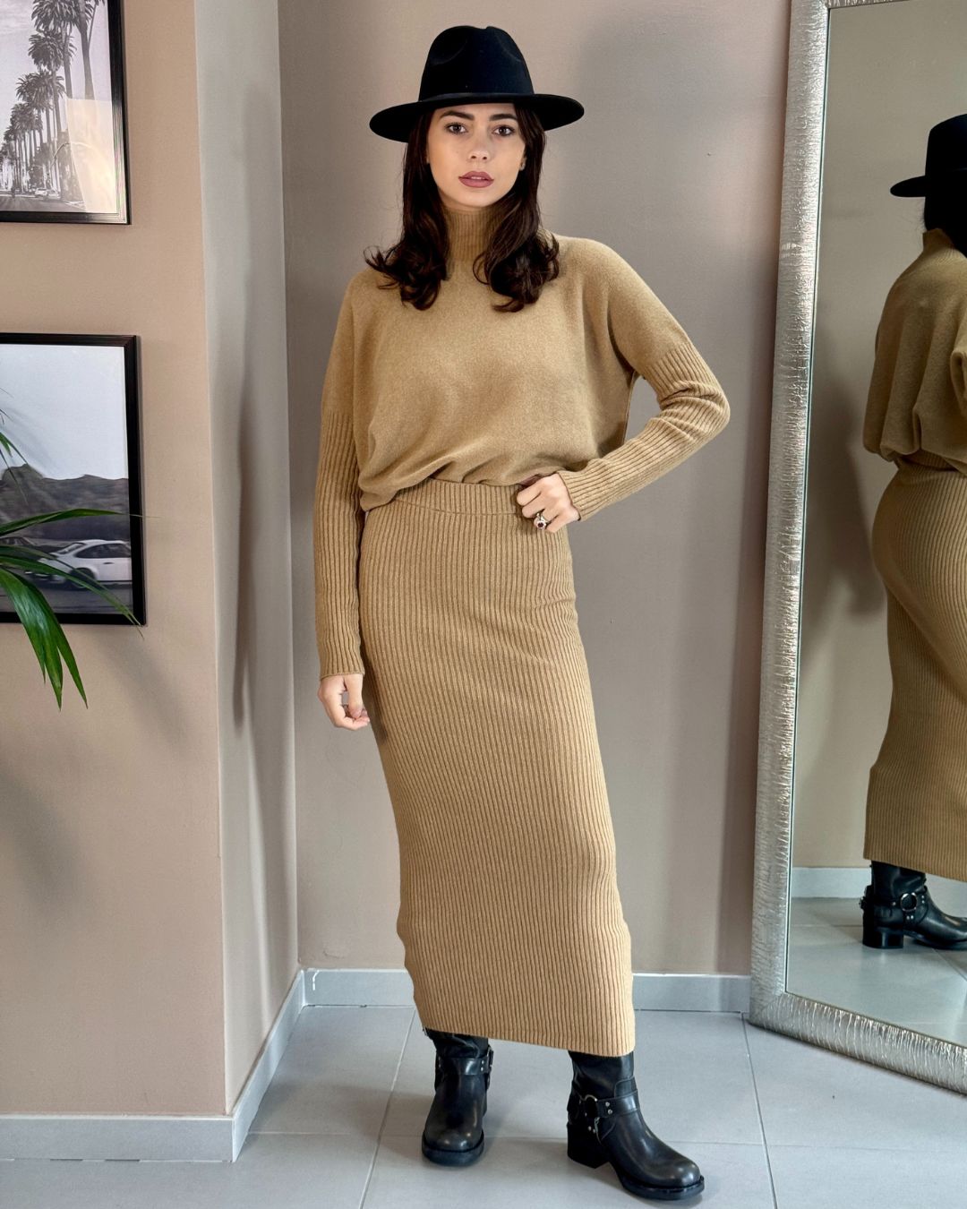 Set maglione con gonna longuette in lana rasata, dettaglio a costine. Elasticizzato.