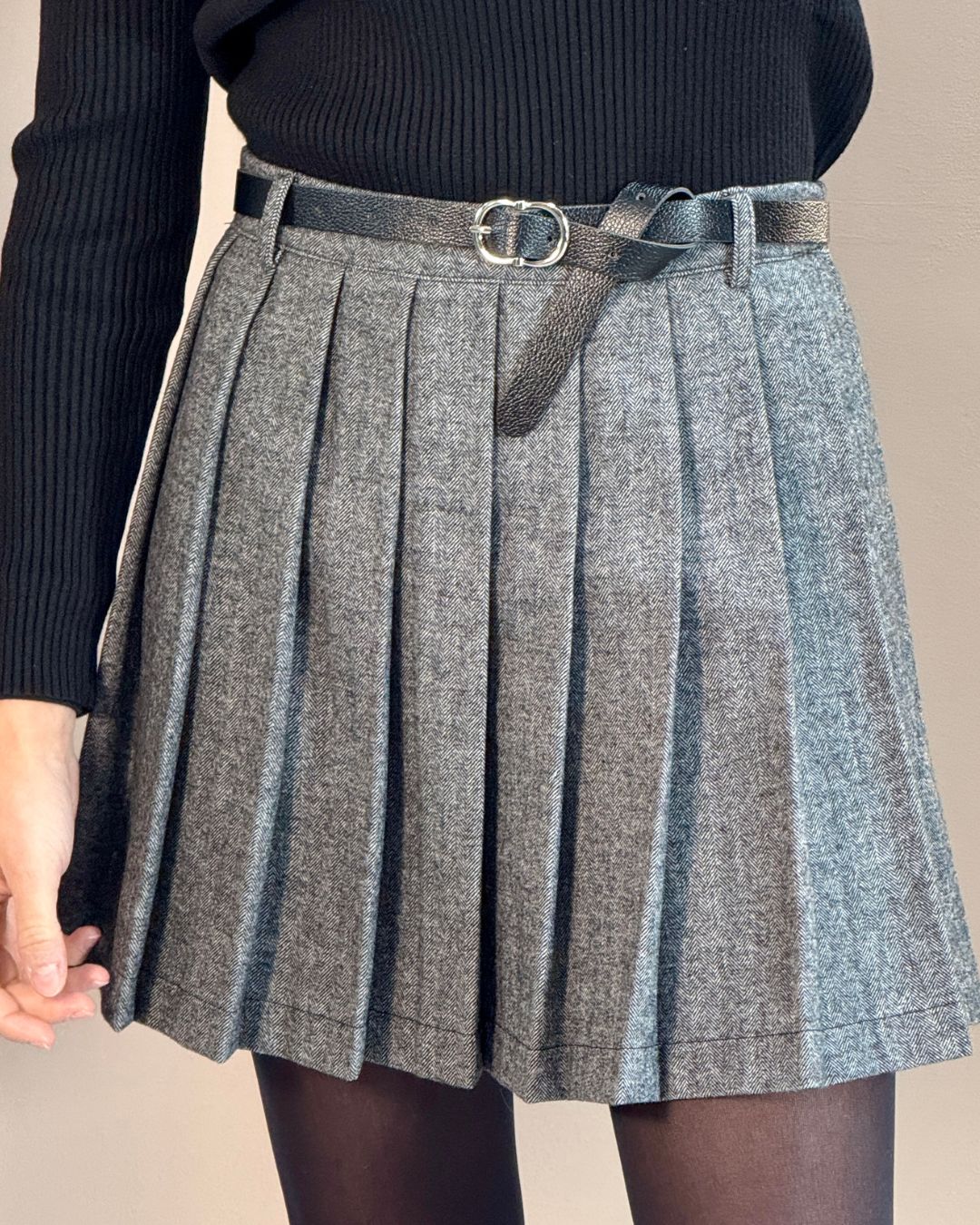 Gonna in lana a pieghe, tessuto spigato, cintura inclusa.