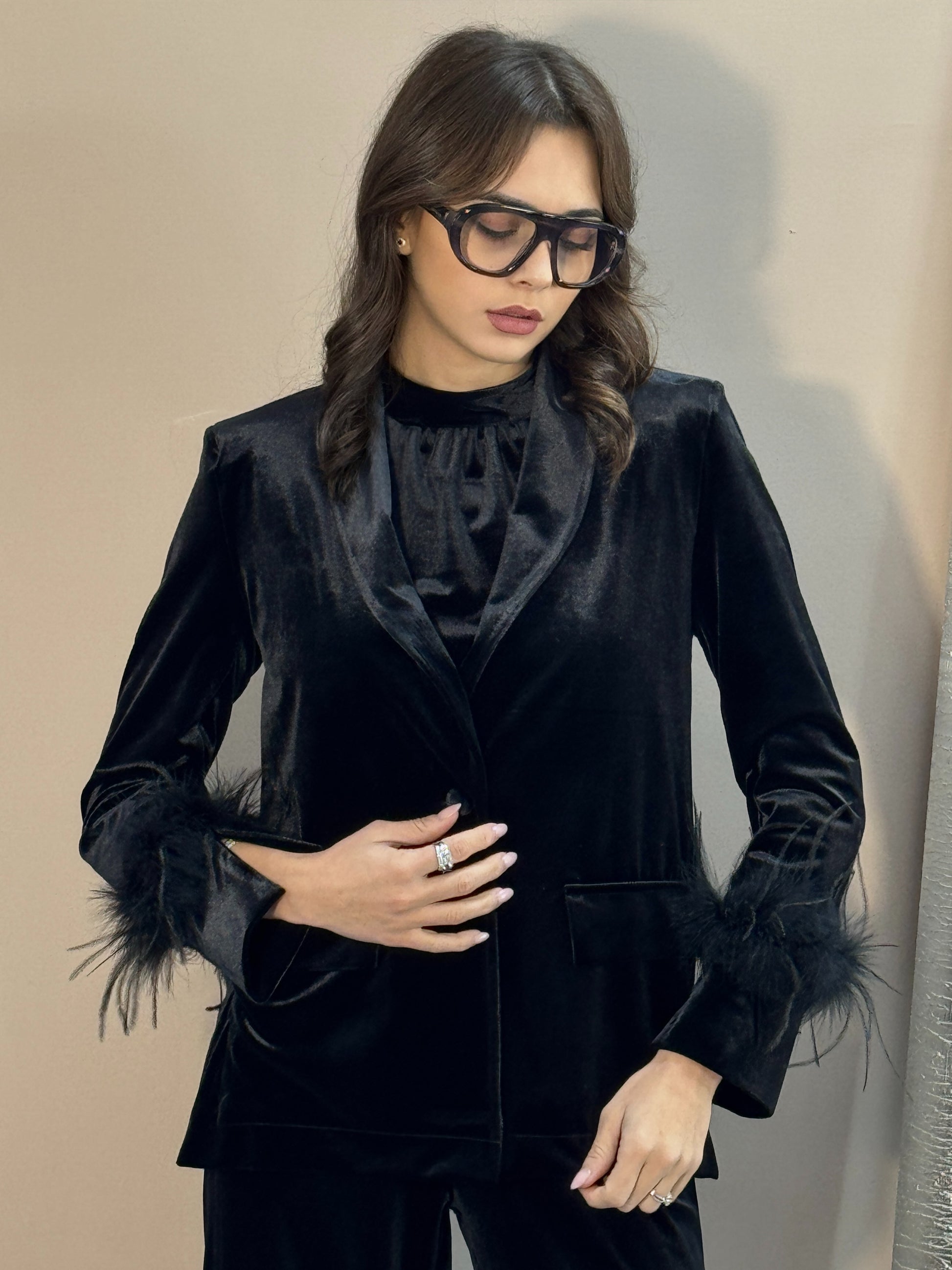 Blazer in morbido velluto nero, dettaglio polsini con piume, un bottone.