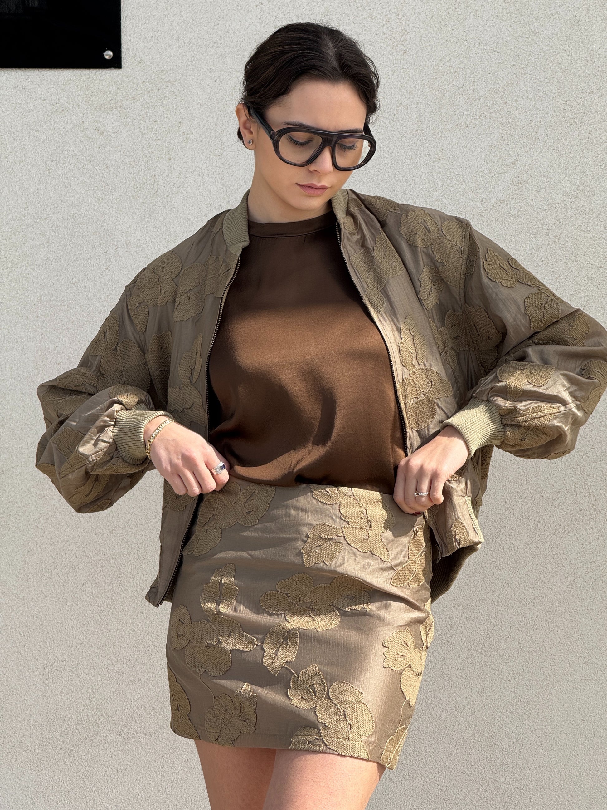 Bomber misto lino con applicazioni ricamate su tessuto.