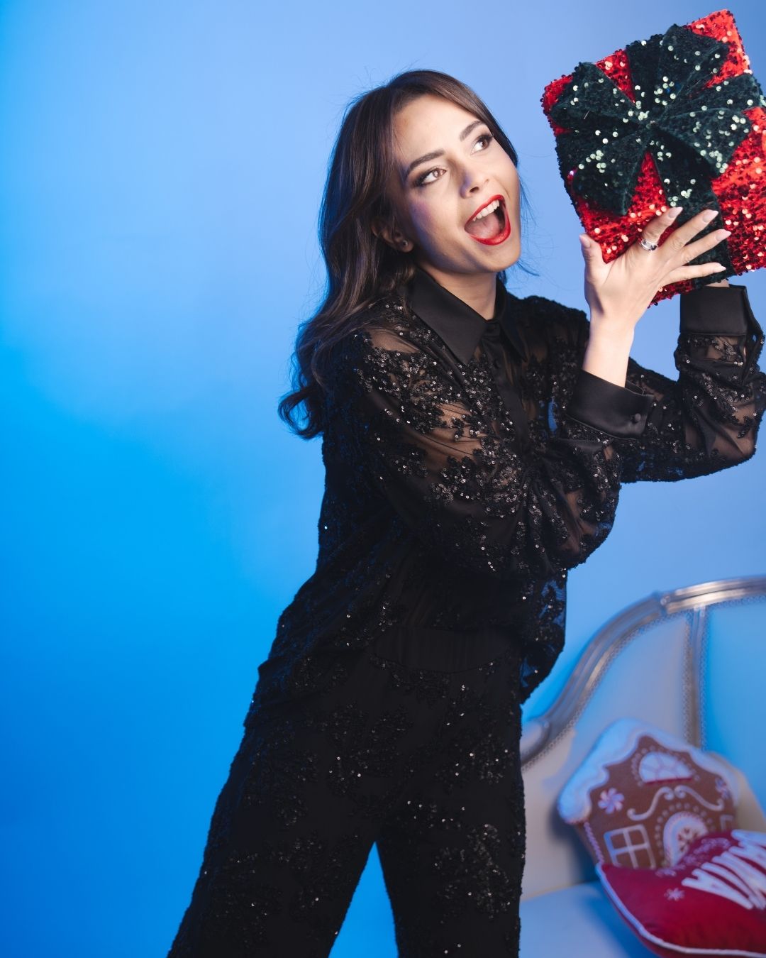Camicia nera trasparente con ricami paillettes, dettaglio collo e polsino in raso nero, vestibilità ampia.