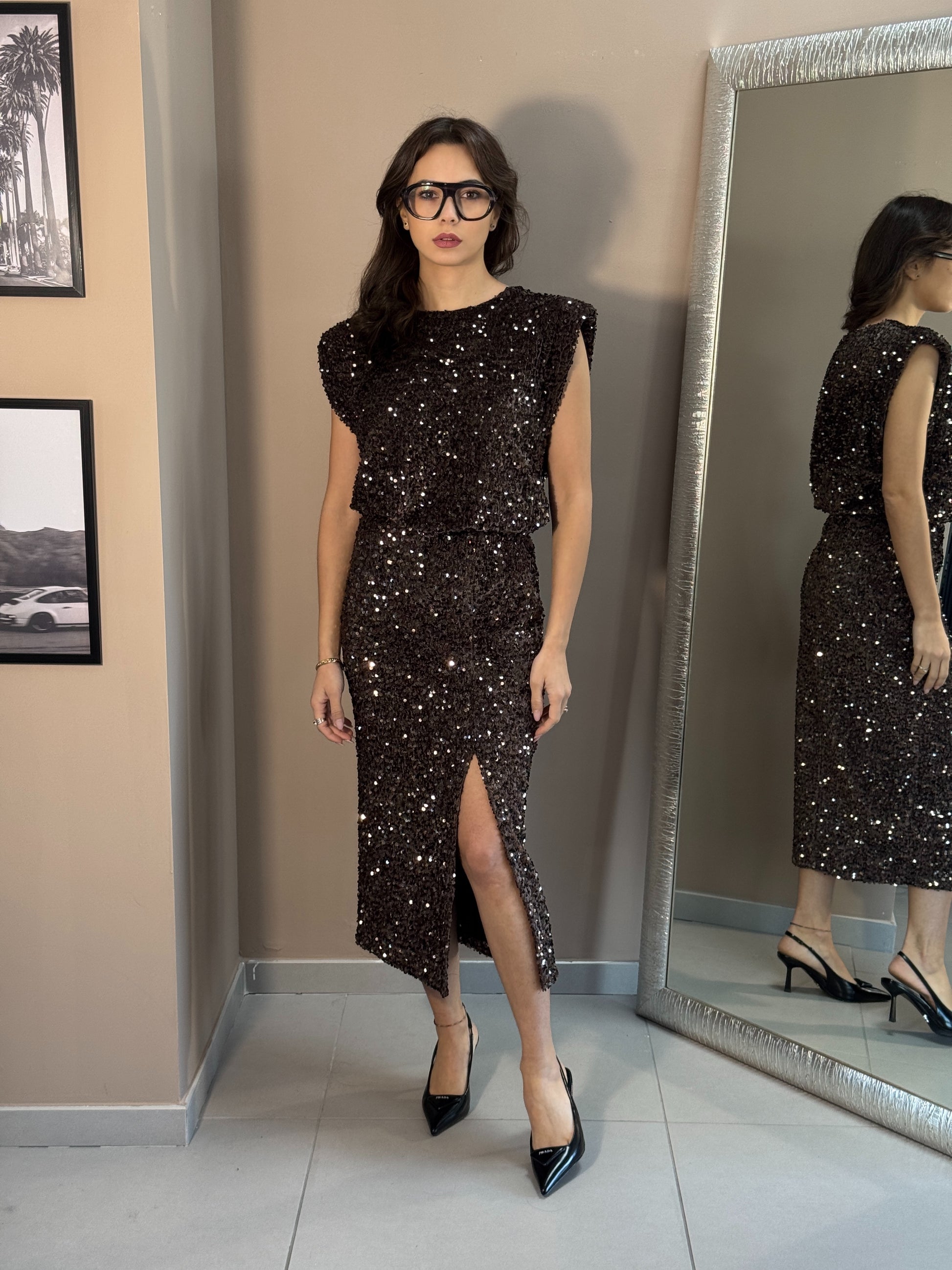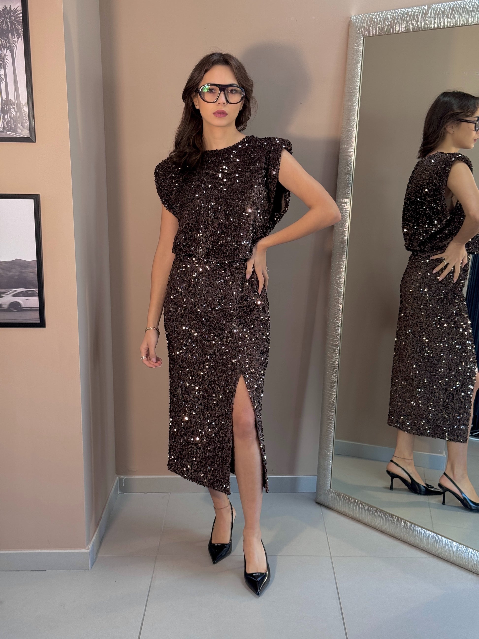 Gonna longuette in velluto full paillettes con dettaglio spacco.