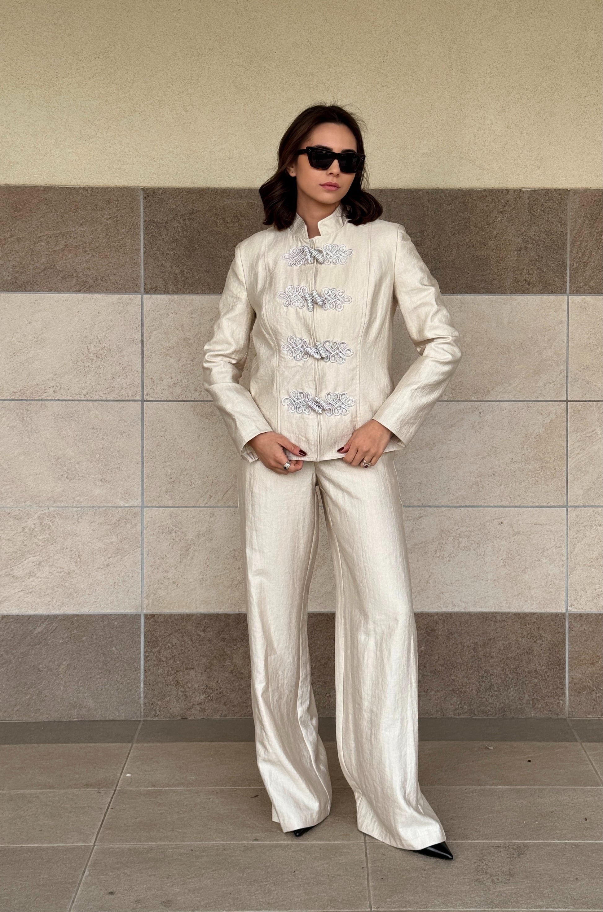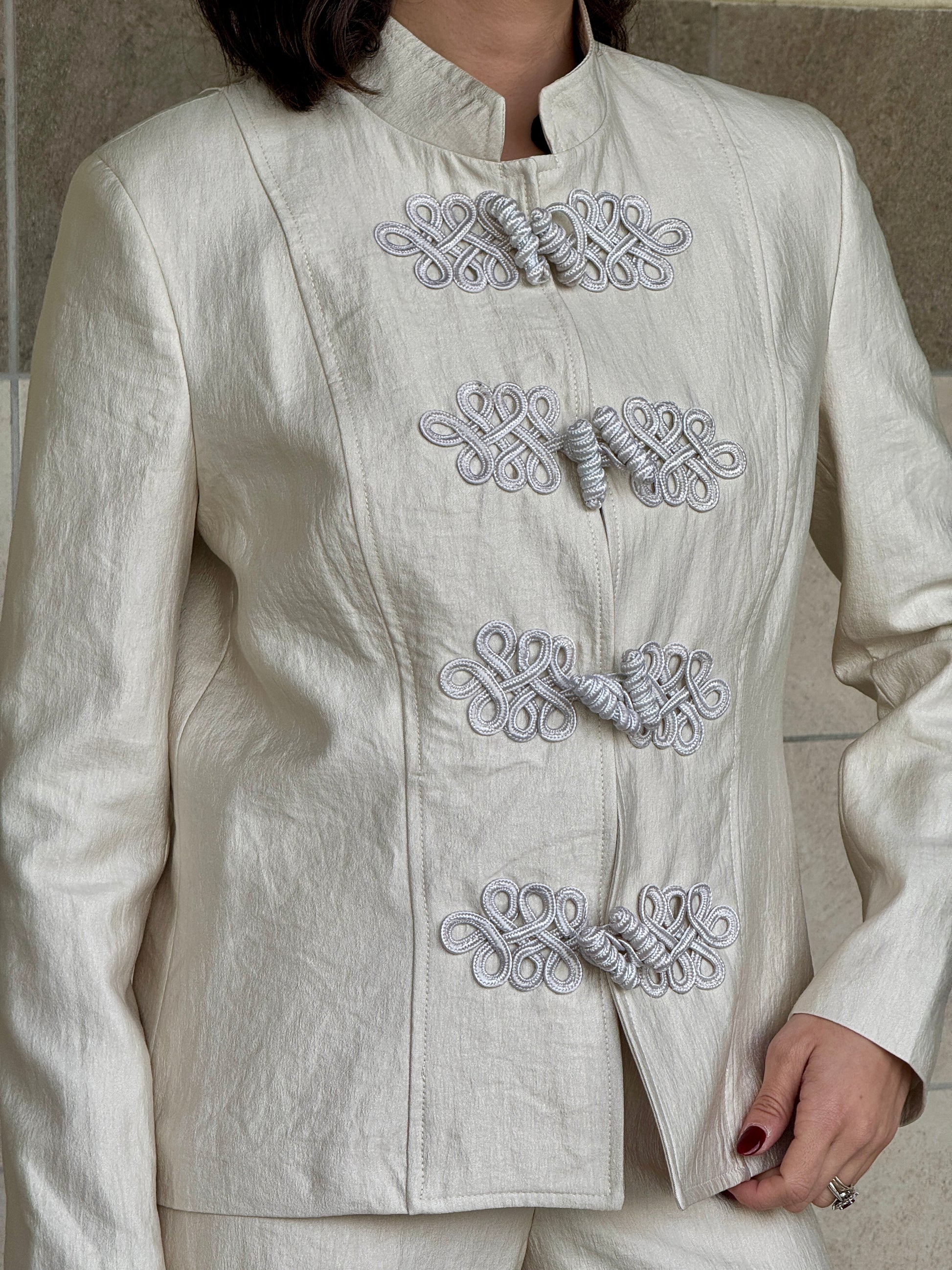 Giacca mandarin in tessuto taftà effetto increspato nell’unica variante colore Avorio.