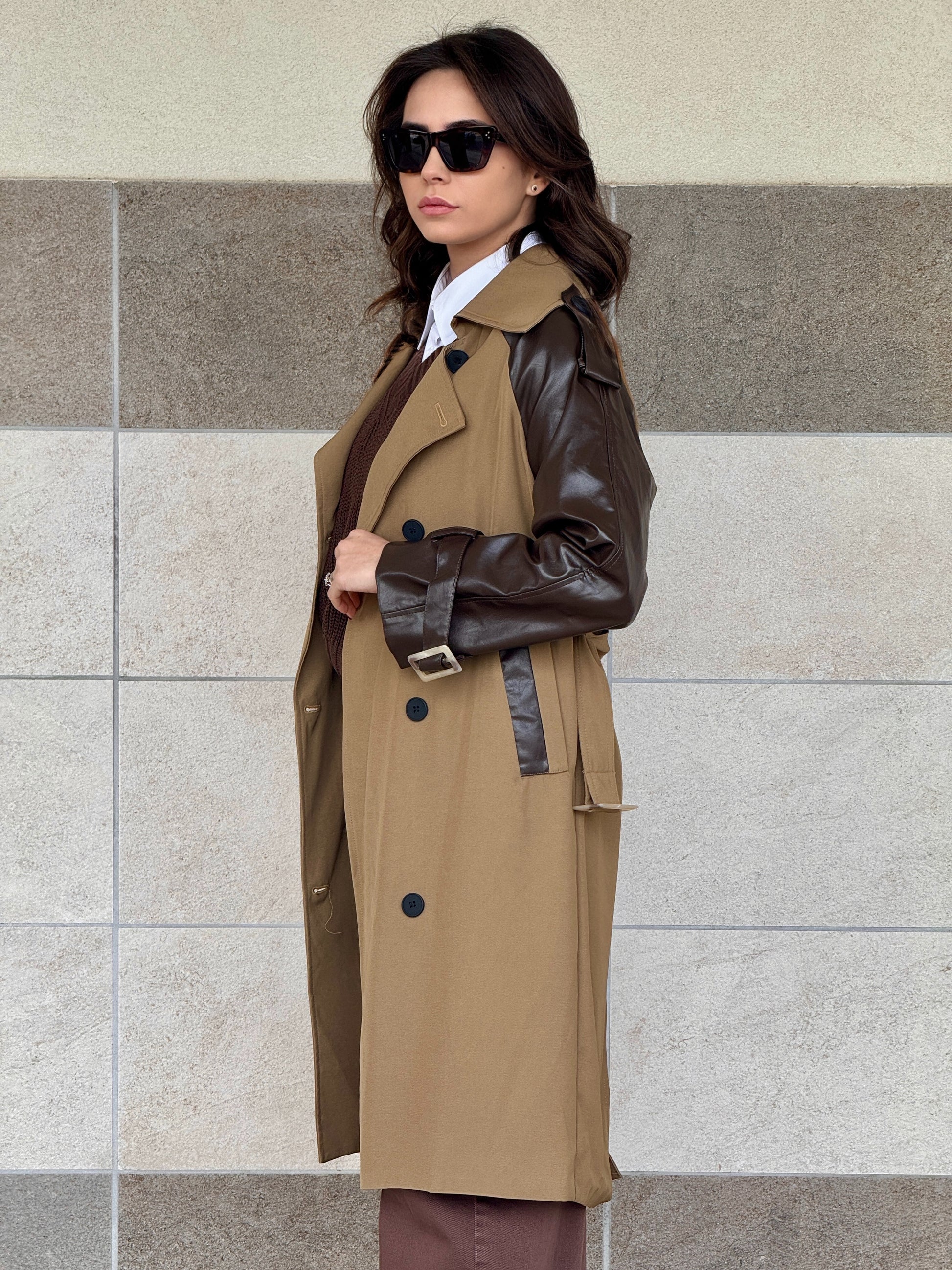 Trench color Camel con maniche e profili in similpelle marroni.